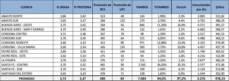 En el cuadro puede observarse que las columnas de participación en cantidad de tambos y producción, los totales no llegan al 100% ya que faltan los tambos fuera de cuencas tradicionales.