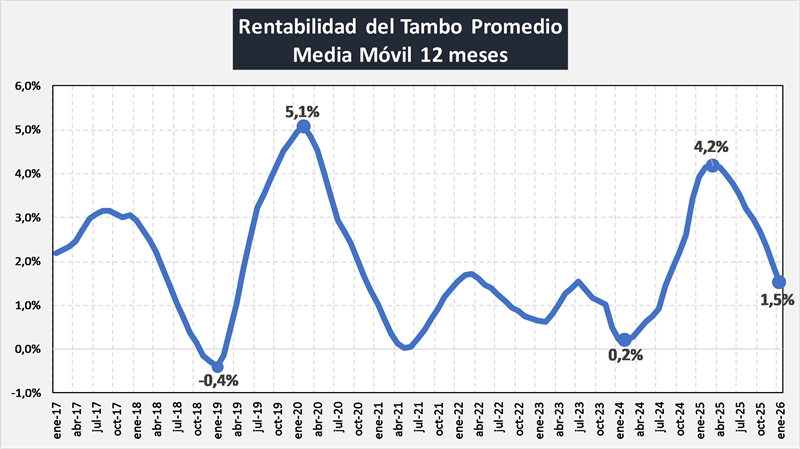 Como lo veníamos informando, se había producido un fuerte desacople en diciembre 2023 (por la devaluación y la alta inflación), entre precios y costos y señalábamos que los precios de la leche venían creciendo por encima de la inflación y que pronto se produciría la convergencia, es por ello que ya en febrero de 2024 se puede observar una tasa de rentabilidad positiva que luego entre marzo 2024 y abril de 2025 se mantiene entorno al 4% con un pico de 5,8% en agosto de 2024. Luego los precios se comenzaron a ajustar por debajo del índice inflacionario, los costos crecen en términos relativos por encima de los precios y la rentabilidad comienza a descender. En noviembre próximo pasado la tasa de rentabilidad perfora el eje y cae al -0,3%, en diciembre 2025, la tasa alcanza el 1% negativo y ahora en el último mes disponible, llega a -1,4%.