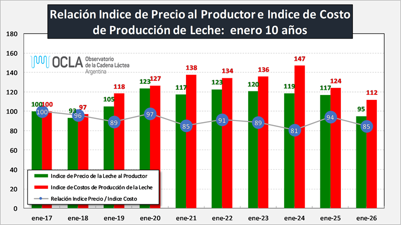 En enero de 2026 se cae el índice precio y el índice costo en menor magnitud, lo que hace caer la relación a un valor 85. En la comparación interanual el precio baja 9 puntos porcentuales más que el costo, lo que hace que la relación entre ambos ser reduzca un 9,9%. Como ya lo indicamos en el informe de costos, los precios se vienen ajustando por debajo de la inflación, pero una situación similar venía ocurriendo con los principales costos, lo cual mantenía favorables aún las relaciones de precios. Esa situación empeora en los cinco últimos meses y de continuar esta leve pero consecutiva desmejora de los precios respecto a los costos, las relaciones pueden comenzar a tornarse muy desfavorables. Es importante que siga recuperándose el consumo doméstico y que siga mejorando la situación de precios de exportación, sobre todo dado la continuidad en el crecimiento de la producción en términos interanuales.