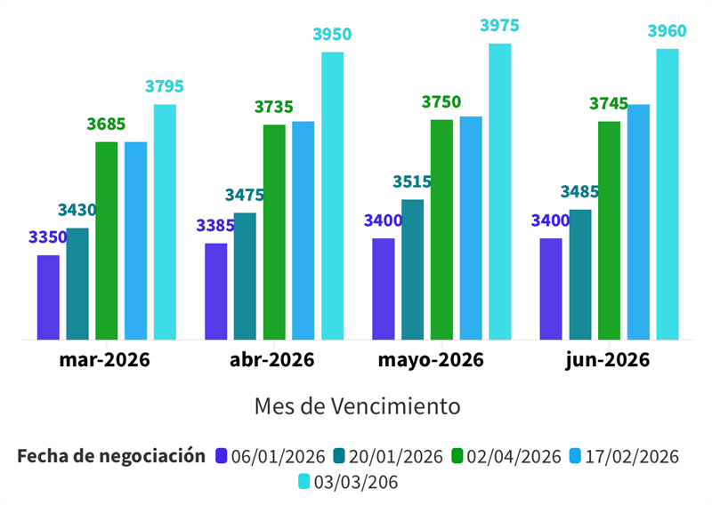 La evolución de los contratos de futuros refuerza esta lectura. Las cotizaciones para vencimientos entre marzo y junio de 2026 siguen en una trayectoria ascendente, con ganancias sucesivas en las últimas sesiones.