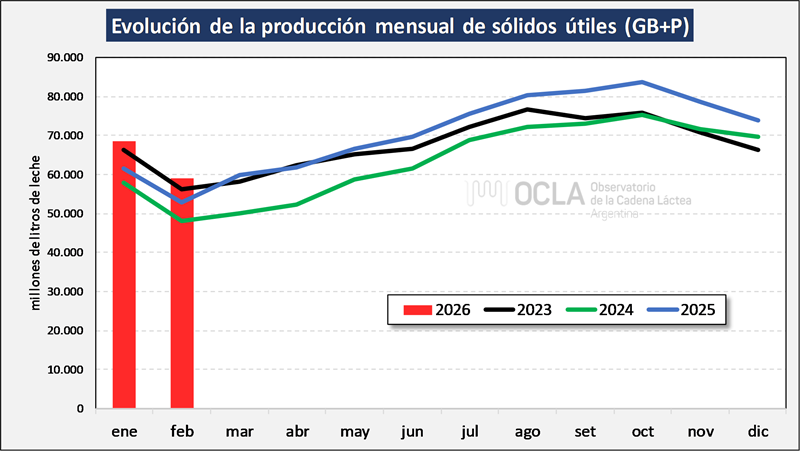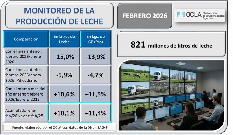 En el mes de febrero del 2026 la producción fue de 821millones de litros de leche, esto implica un valor 15,0% por debajo del mes anterior (-5,9% en el promedio diario), un 10,6% más que igual mes del año anterior.