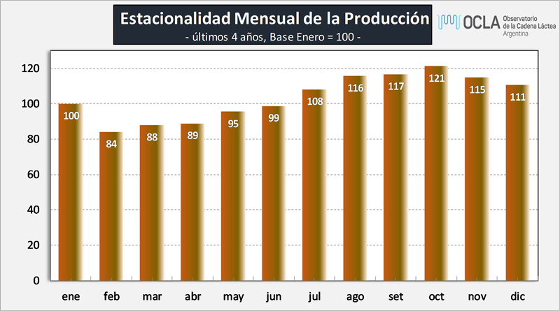 Como es habitual, la producción desde el pico de máxima en octubre, cae a una tasa del 5 al 6% mensual hasta marzo/abril (tomando el promedio diario de producción, para que no afecten la cantidad de días de cada mes), donde luego comienza un nuevo repunte hacia octubre.
