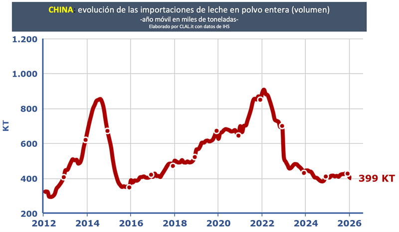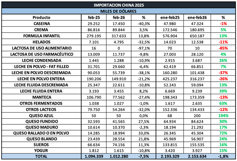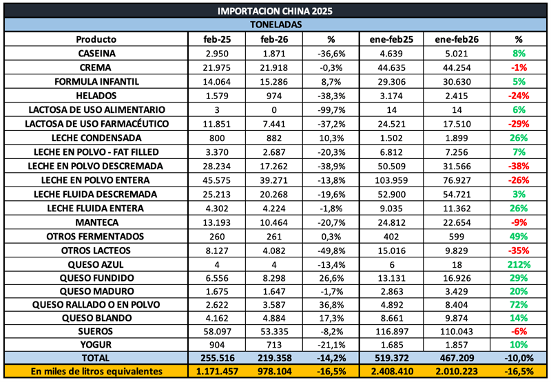 CHINA: importaciones de productos lácteos a febrero de 2026 25/3/2026