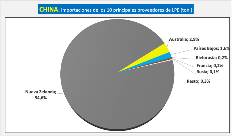 China es el principal importador de Leche en Polvo Entera y su principal proveedor es Nueva Zelanda quien ostentó el 94,6% de participación de ese producto en el gigante asiático en los dos primeros meses de 2026, levemente superior a la participación de igual período del 2025 que fue del 94,5%