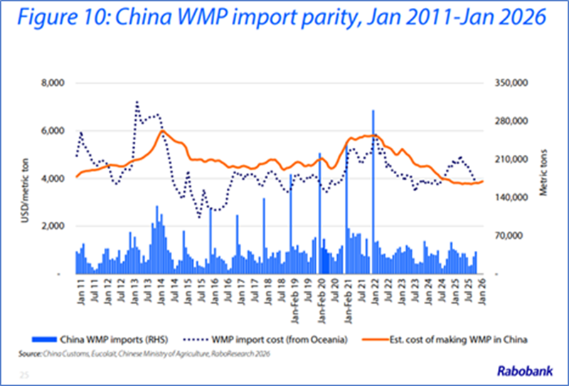 A finales de enero, el precio promedio de la leche en granja en China había disminuido un 2,7% interanual, hasta los 3,03 CNY/kg (0,435 USD/kg), manteniéndose estable desde noviembre de 2025, lo que indica una mejora en el equilibrio entre la oferta y la demanda. Los precios de la leche entera en polvo (LPE) de Oceanía alcanzaron los 3313 USD/t a principios de enero. El último análisis de paridad de importación de Rabobank muestra que la LPE desembarcada de Oceanía ahora tiene un precio un 2% inferior al costo promedio de producción nacional de LPE en China.