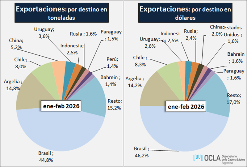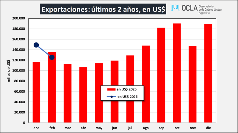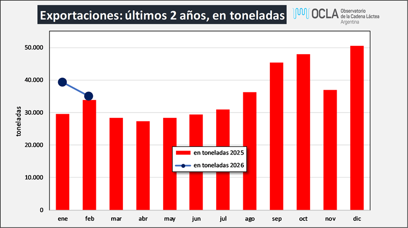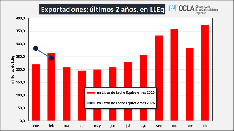 En litros de leche equivalentes a febrero de 2026, las exportaciones fueron superiores (+8,6%) en el interanual y representaron el 29,3% de la producción total (en ene-feb de 2024 representaron el 35,6%). En particular las exportaciones de febrero 2025 representaron en litros equivalentes el 29,6% de la producción del mes.