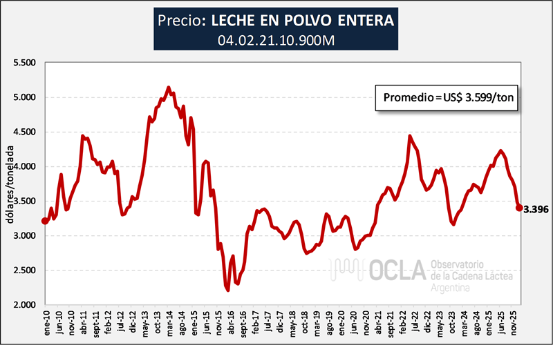 En el gráfico siguiente puede verse la evolución del precio de la Leche en Polvo Entera en bolsa de 25 kgs. NCM 04.02.21.10-900M: