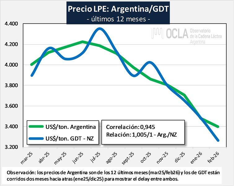 Como lo mencionamos reiteradamente, los precios de la leche en polvo siguen en forma muy similar los valores del Global Dairy Trade pero con un retraso de 2 a 3 meses, el gráfico siguiente muestra la gran correlación entre ambas series (0.945) y prácticamente sin diferencias en términos absolutos (0,5%). Ese retraso en este gráfico se muestra comparando los valores de LPE en bolsa de 25 kgs. NCM 04022110 900M del período marzo25/feb26 versus precios de la LPE del GDT del período ene25/dic25. 2 meses de delay para Argentina.