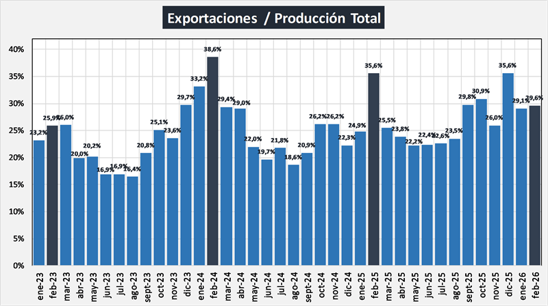 Febrero de 2026 tiene una participación de las exportaciones medidas en LLEq respecto a la producción total del 29,6%, valor bastante por encima de la media del 25%, pero más bajo que los dos febreros previos donde los volúmenes de producción total fueron más bajos.
