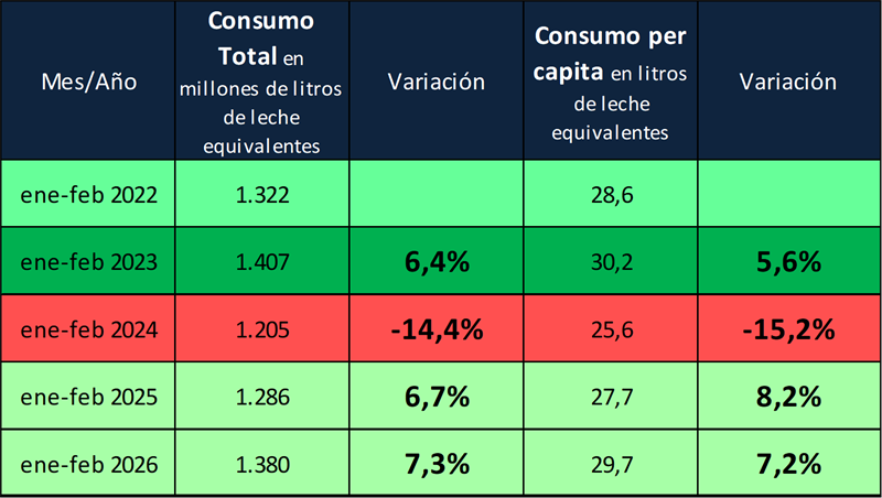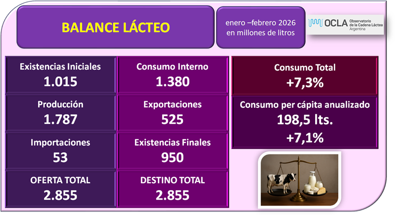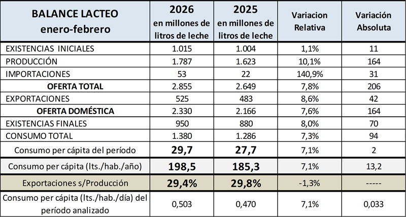 Análisis del Balance Lácteo a febrero 2026 y comparación con igual período del año anterior:
