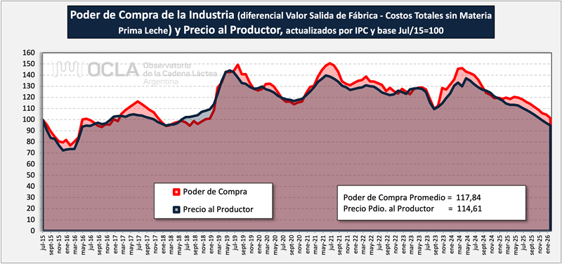 Viendo el precio real liquidado al productor y comparado con la capacidad de pago promedio de la industria, actualizada por IPC y llevado a base julio 2015 = 100, para un período más prolongado, puede observarse que en el largo plazo (salvo oscilaciones temporales) los valores promedio convergen: Indice 114,61 por litro de Precio al Productor e Indice 117,84 por litro de Poder de Compra, con un cierto distanciamiento en el período nov23-ago24 a favor de los poderes de compra, y equiparándose ambos índices entre sep24-feb25 y volviendo a ser superiores los poderes de compra en el último año.