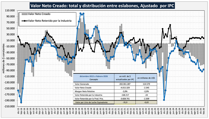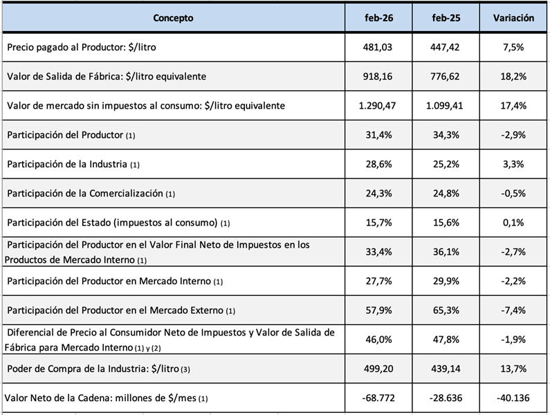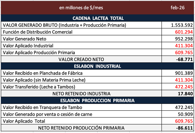 La cadena presenta un resultado negativo en febrero de 2026 de $ 68.772 millones (5,9 centavos de dólar por litro de leche equivalente). El sector industrial tiene un resultado estimado positivo de $ 17.840 millones (US$ 12,7 M) y el sector primario tiene un resultado negativo de $ 86.612 millones. (- US$ 61,4 M).