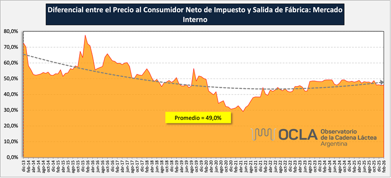 La participación del productor en el total del sistema fue para febrero de 2026 del 31,4%, 0,1 puntos por debajo del mes anterior y 0,8 de la media, y 2,9 puntos por debajo del año pasado. Los valores finales de mercado interno cayeron 0,2 puntos y los de mercado externo aumentaron 1,5 puntos porcentuales respecto al mes anterior. En el interanual baja 2,2 puntos en el mercado interno y 7,4 puntos en el externo. La participación del productor sobre el valor de salida de fábrica (precio al que vende la industria) fue de 52,4%, 0,1 puntos por arriba del mes anterior, 5,2 puntos por debajo del año anterior y 1,6 puntos por debajo del promedio de la serie (54,0%).