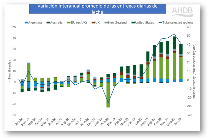 Las entregas en Nueva Zelanda aumentaron 1,5 millones de litros diarios (+2%) interanual, con un promedio diario de 76,2 millones de litros en enero. La confianza de los productores se vio respaldada por los precios estables de la leche y las condiciones climáticas favorables, que incrementaron la producción lechera. Las entregas de leche en Argentina continuaron creciendo, con un aumento de 2,8 millones de litros diarios (+9,7%) en enero, en comparación con el año anterior. La inversión, las condiciones climáticas favorables y la buena situación económica de los productores impulsaron una mayor productividad. Sin embargo, la caída de los precios de la leche ha reducido la rentabilidad, lo que ha provocado un menor crecimiento previsto para 2026.