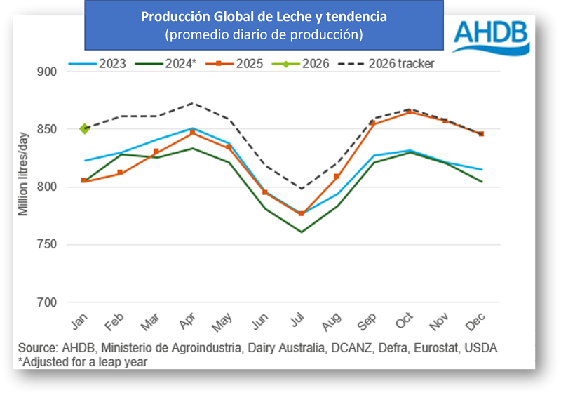 Este gráfico muestra la distribución mundial de leche en millones de litros por día durante un período de 12 meses. Línea azul = 2023, línea verde oscuro = 2024, línea naranja = 2025, símbolo verde claro = 2026, línea gris punteada = indicador de 2026.