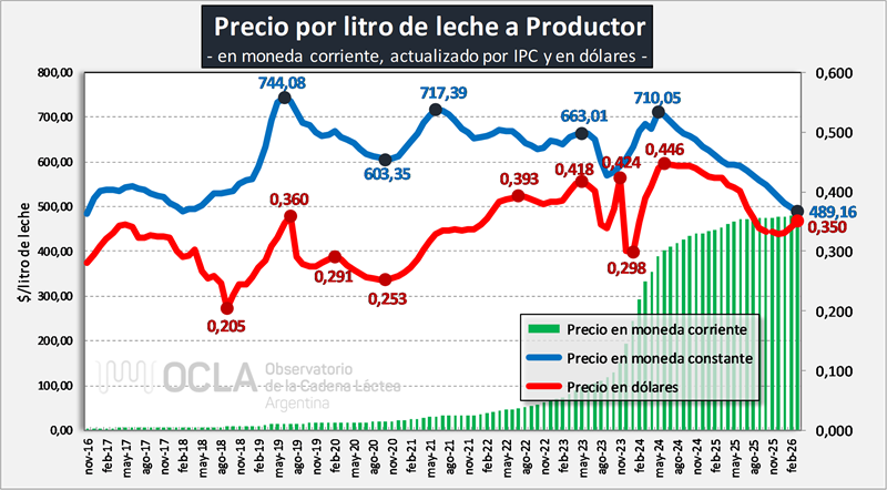 En una visión de más corto plazo el gráfico anterior muestra el precio por litro de leche actualizado a marzo 2026 por inflación y que este es el más bajo de las series analizadas.