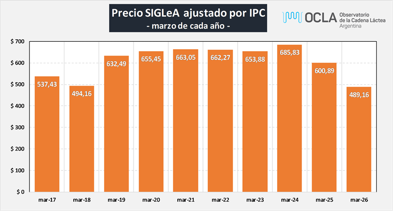 Viendo exclusivamente el precio en pesos ajustado por IPC de los meses de marzo desde que está vigente la serie SIGLeA, marzo de 2026 es el más bajo de los últimos 10 años.