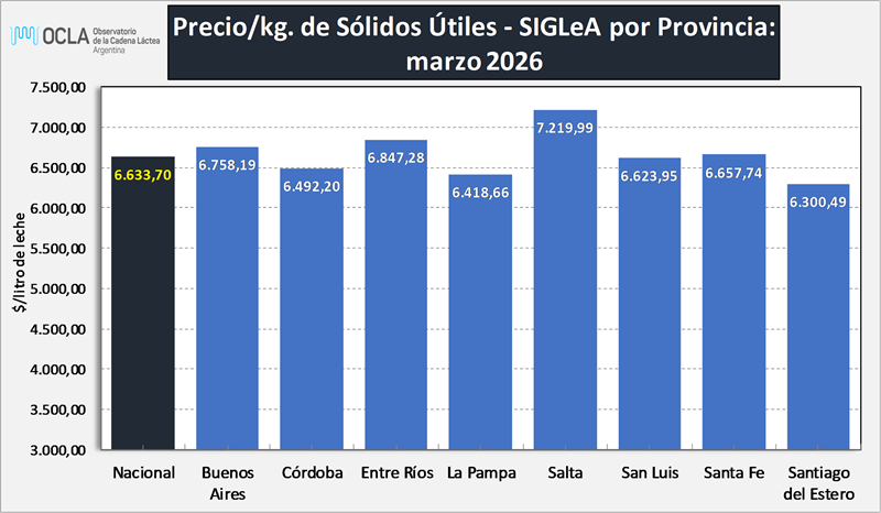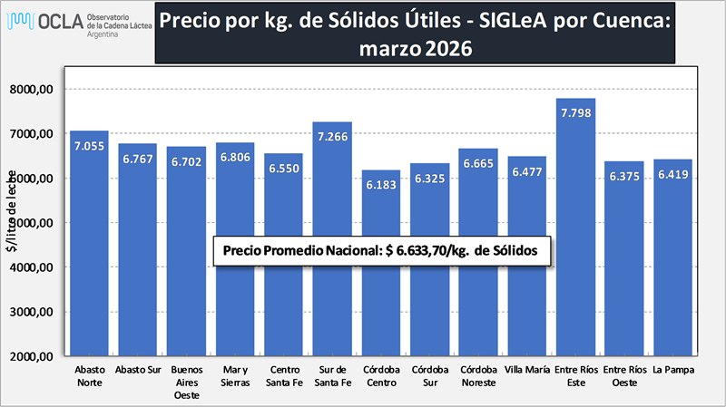 A continuación, se puede ver el Precio SIGLeA por litro de leche y por kg. de Sólidos Útiles (Grasa Butirosa + Proteína) discriminado por Provincia y por Cuenca Lechera.
