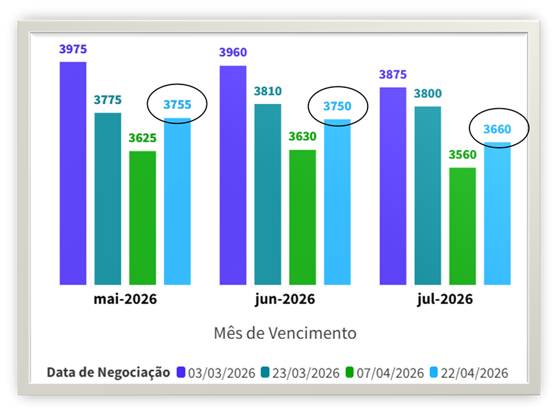 Este movimiento refleja, por un lado, la continuidad de un escenario de oferta internacional más equilibrado, que respalda los precios. Por otro lado, la presión a corto plazo se había visto influenciada por un entorno global más incierto, asociado a tensiones geopolíticas. Con los recientes indicios de una tregua entre los países involucrados, se observa una reducción de esta presión, lo que contribuye a la recuperación de los precios futuros.