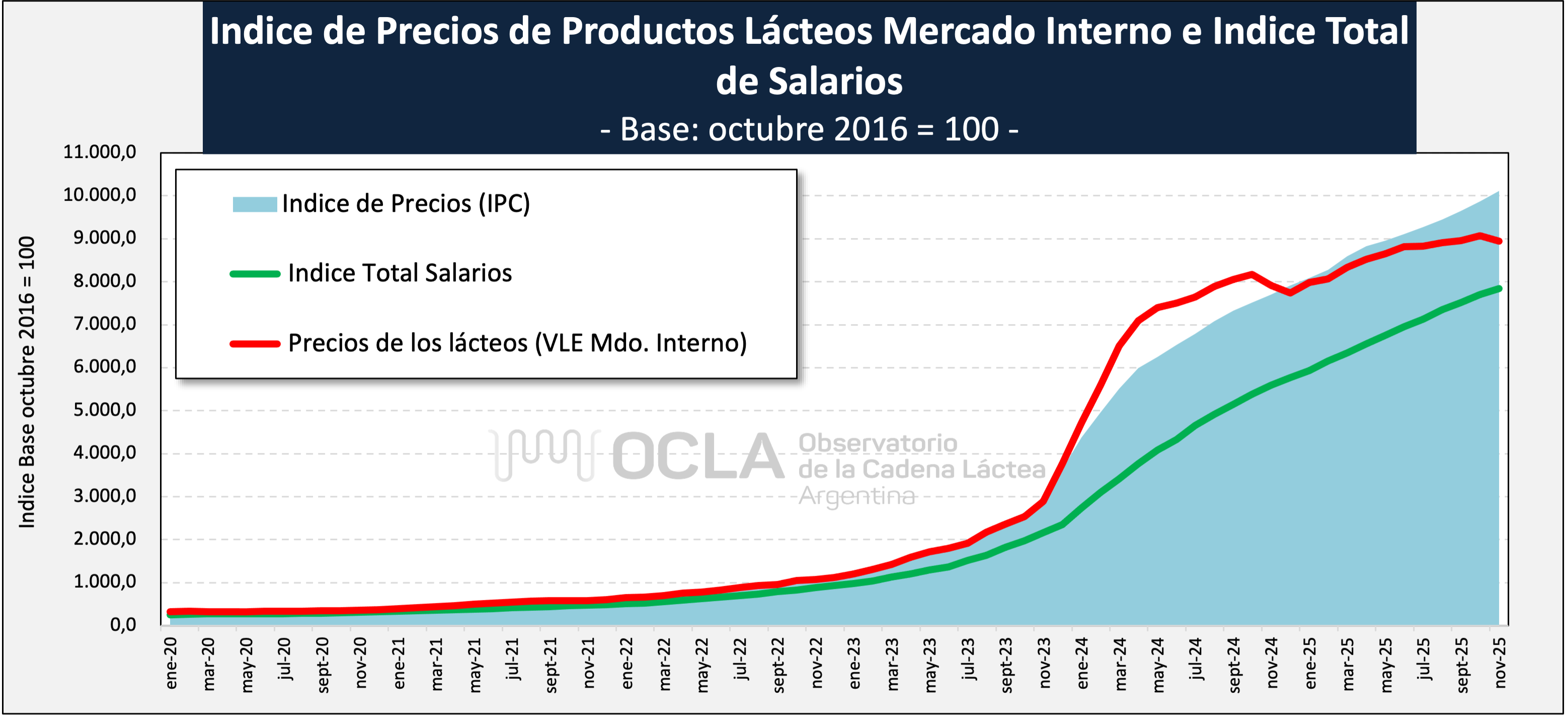 Índice de Precios de Productos Lácteos en el Mercado Interno e Índice Total de Salarios