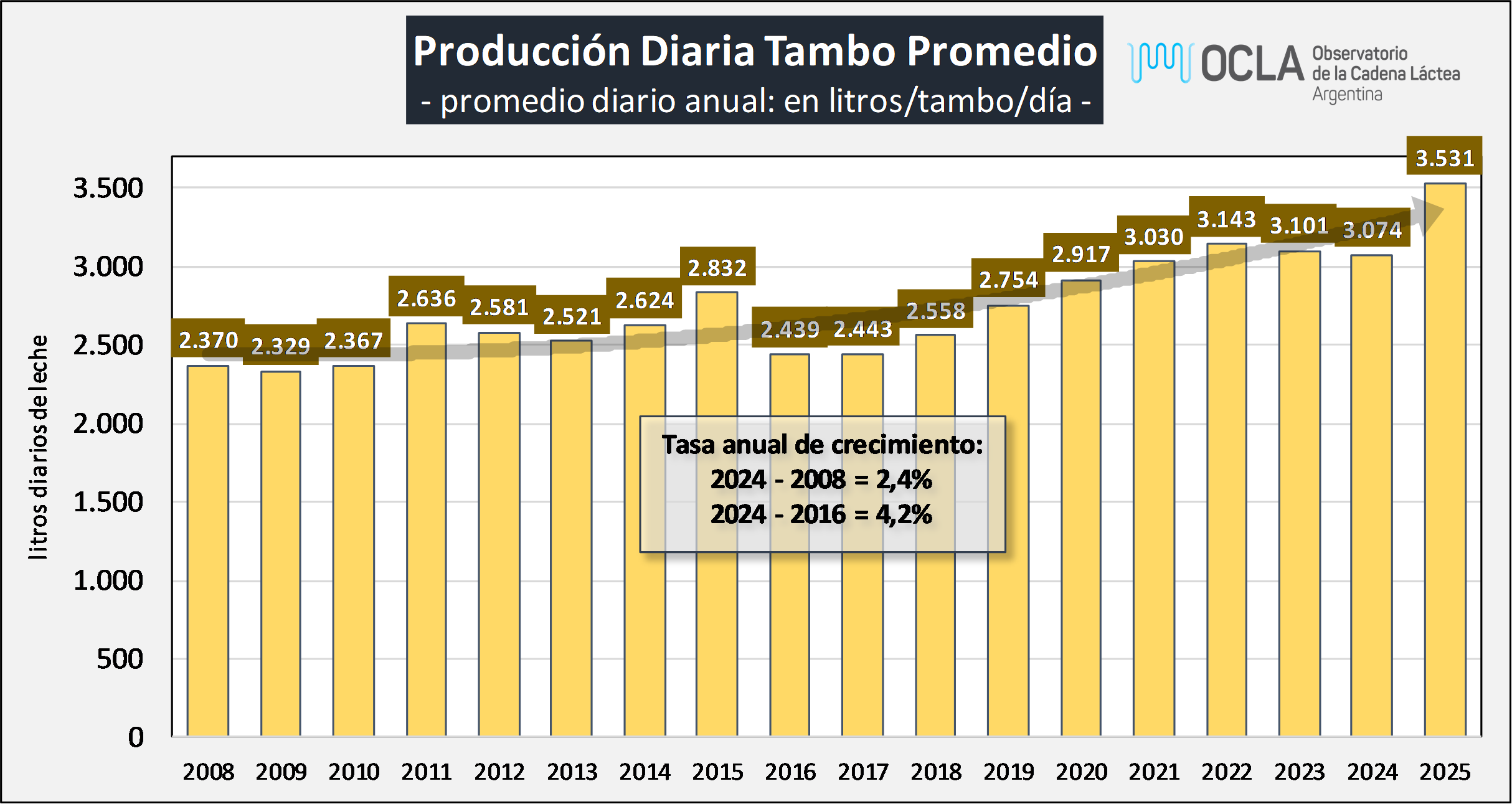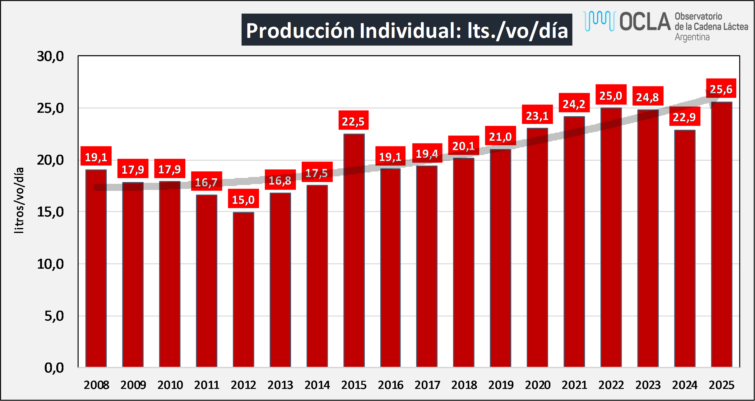 Producción por Vaca en Ordeño y por día: evolución anual