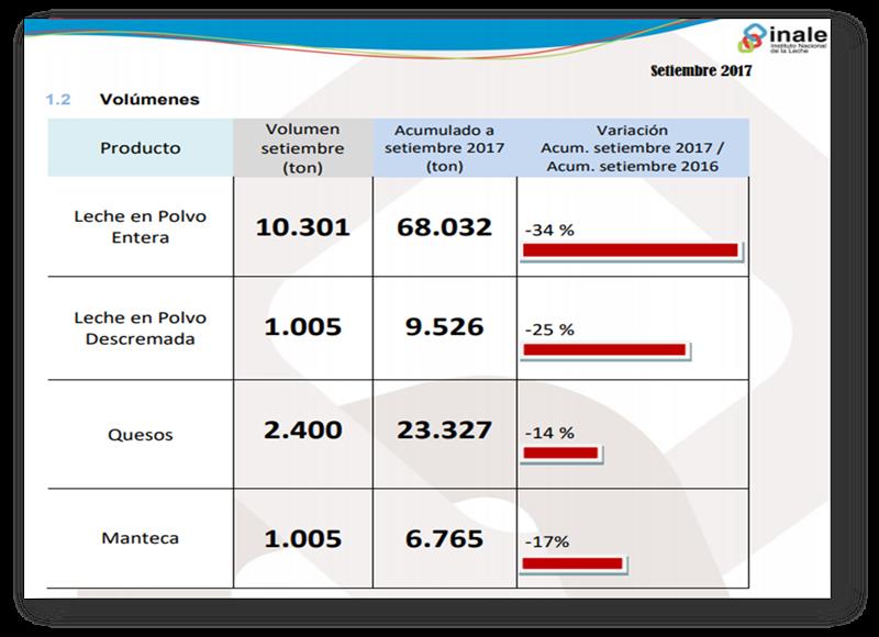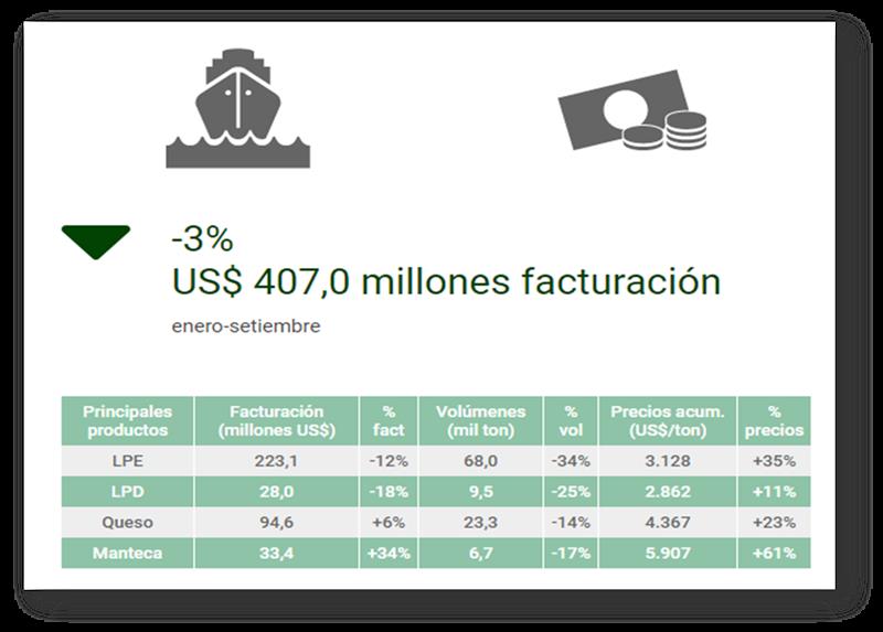 En el período enero-septiembre de 2017 respecto a igual lapso del año anterior, las exportaciones de Uruguay, fueron un 3% inferiores en facturación y 28% menores en volumen (cálculo OCLA en base a datos agregados y participaciones relativas), con la particularidad de una caída del volumen de exportación de leche en polvo entera del 34%.
