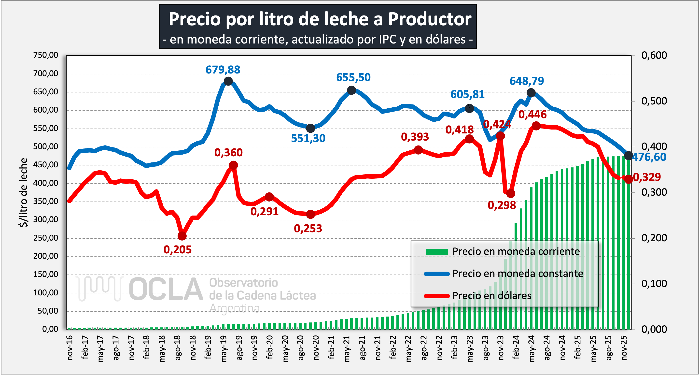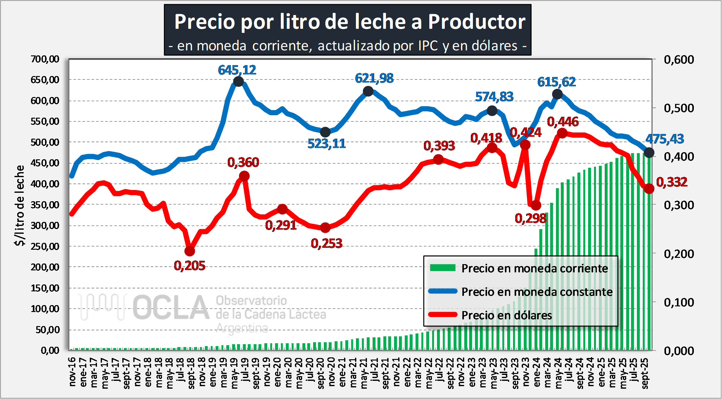Precio al Productor: en monedad corriente, constante y en dólares por litro