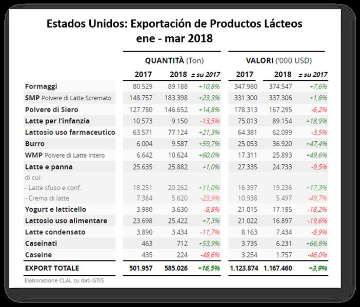 Las exportaciones positivas de LPD, queso, mantequilla y LPE, en marzo de 2018 en comparación con marzo de 2017, tanto en cantidad como en valor, mientras que el suero en polvo crece en cantidad, pero disminuye en valor. Por el contrario, la leche para los niños aumenta de valor, mientras que los volúmenes vendidos fuera de las fronteras estadounidenses caen.
