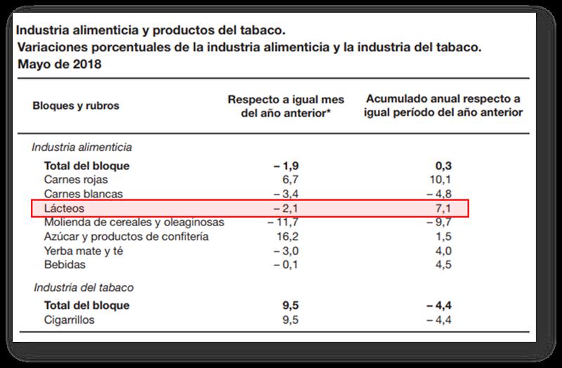 La industria alimenticia presenta en el mes de mayo de 2018 una disminución de 1,9% en comparación con el mismo mes del año 2017, mientras que en los cinco primeros meses del año 2018 se observa un aumento de 0,3% en comparación con el mismo período del año anterior.