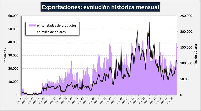 Como se puede observar en el gráfico siguiente donde se presenta la evolución mensual de las exportaciones en volumen y valor, recién encontramos valores superiores a los actuales, en el mes de octubre de 2015.