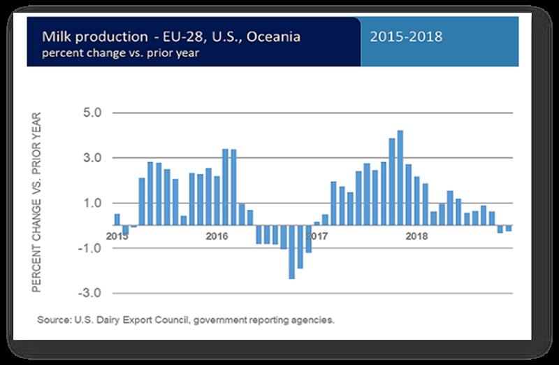 Como el mayor exportador del mundo, la producción de leche de la UE siempre tiene un gran impacto. El clima ha deprimido la producción en Alemania y Francia (-2,1% en octubre-noviembre) y las regulaciones de fosfato han hecho lo mismo en los Países Bajos (-5,7% en septiembre-diciembre). Los crecimientos en Irlanda y Polonia no han sido suficientes para compensar. Las entregas de la UE-28 bajaron alrededor de un 0,5% en los últimos cinco meses de 2018. Estimamos un rendimiento de entre un 1,0% y un 1,5% en el primer trimestre del año y esperamos ver poco o ningún crecimiento para todo el año.
