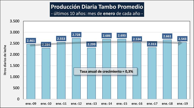 Sobre la base de la producción mensual y la cantidad anual estimada de tambos (10.400 unidades productivas), podemos inferir el tamaño del tambo promedio, unos 2.543 litros de leche diarios para enero de 2019, un 4,4% menos que el año anterior (cabe acotar que la producción total interanual en enero 2019, cayó un 7,3%). Si evaluamos su comportamiento en el tiempo, a pesar de la disminución en el número de unidades productivas y en el número de vacas, el tambo promedio presenta en el período 2009-2019 una tasa de crecimiento acumulada anual del 0,3%, lo que permite el sostenimiento de los niveles productivos agregados a nivel país.