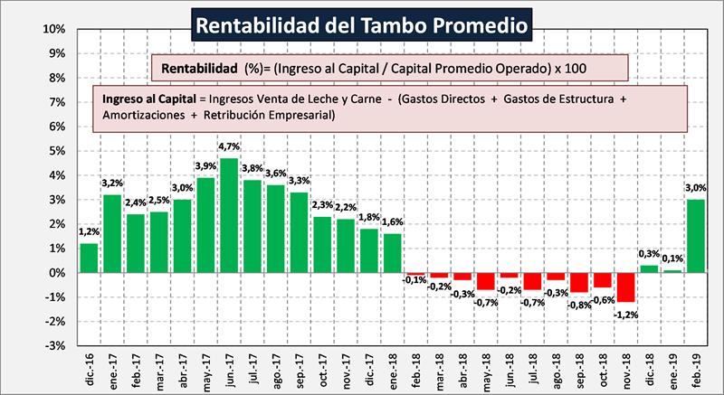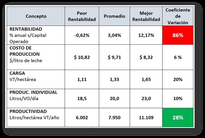 La mejora en la rentabilidad se debe fundamentalmente a un incremento interanual del precio de la leche del 81,4% y del costo de producción del 73,4% (Inflación = 51,3% y Tipo de Cambio = 93,6%). El costo de producción se vincula en diferentes proporciones con esto tres componentes: leche (mano de obra de ordeño y alquileres, por ejemplo), inflación (para algunos bienes y servicios no transables en el exterior) y variación en el dólar (semillas, agroquímicos, fertilizantes, suplementación, tasa de interés, etc.).