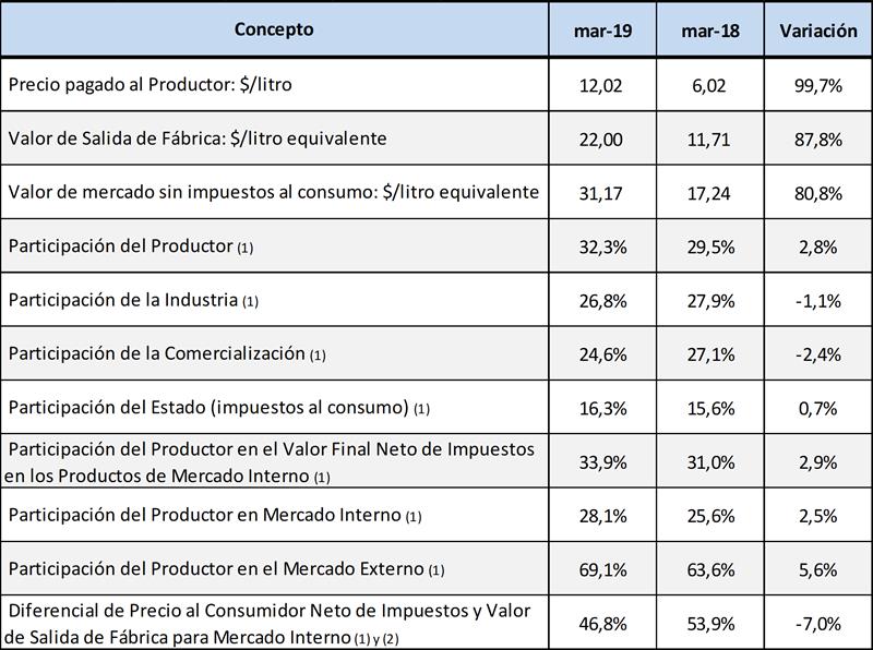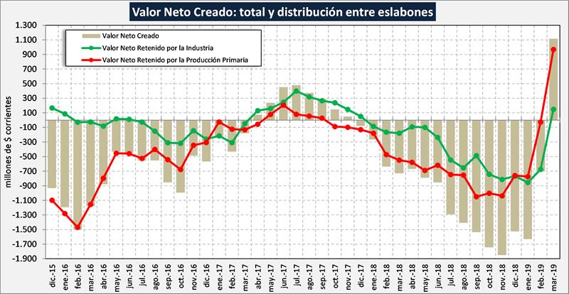 También se evidencia la mejora en el sector primario ya que la participación del productor en el valor final neto de impuestos en el mercado interno creció del 31,0% en marzo de 2019 al 33,9% en la actualidad.