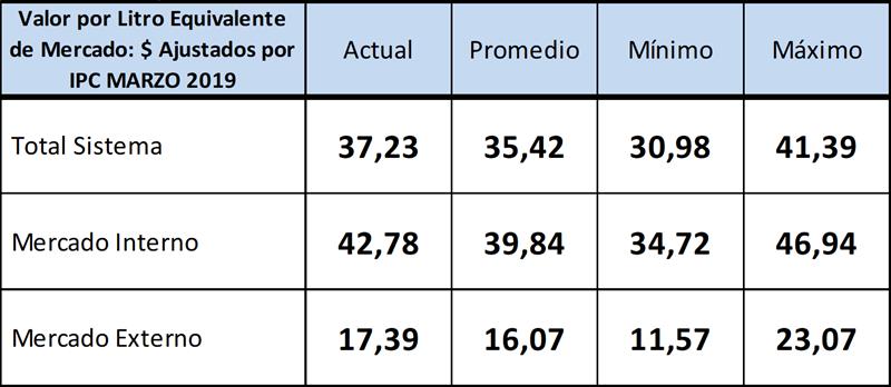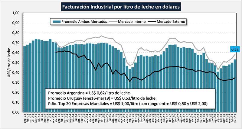 El gráfico superior muestra claramente en las barras azules que la facturación (valor de salida de fábrica) en dólares, llegó a los 53 centavos/litro de leche equivalente luego de alcanzar un mínimo en septiembre del año pasado de 41 centavos, cuando la media histórica era de 62 centavos y se lograron picos de 74 centavos. Igual proceso sigue el precio al productor que medido en la moneda americana, estuvo en marzo de 2019 en US$ 0,291, luego de haber llegado al pico de mínima en septiembre pasado con US$0,209/litro con una media en los últimos 5 años de US$ 0,295 y un pico máximo de US$ 0,37.
