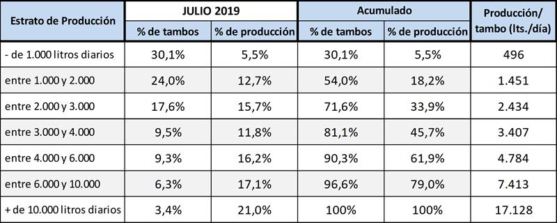 Puede observarse que los tambos de menos de 2.000 litros diarios de leche que representan el 54,0% de las unidades productivas, aportan el 18,2% de la leche total, y en el otro extremo los tambos de más de 10.000 litros diarios, que son sólo el 3,4% del total, aportan un volumen del 21,0%. Los 355 tambos del estrato de + de 10.000 litros que producen un promedio de 17.128 litros diarios, aportan la misma cantidad de leche que 6.062 tambos que producen menos de 3.000 litros diarios.