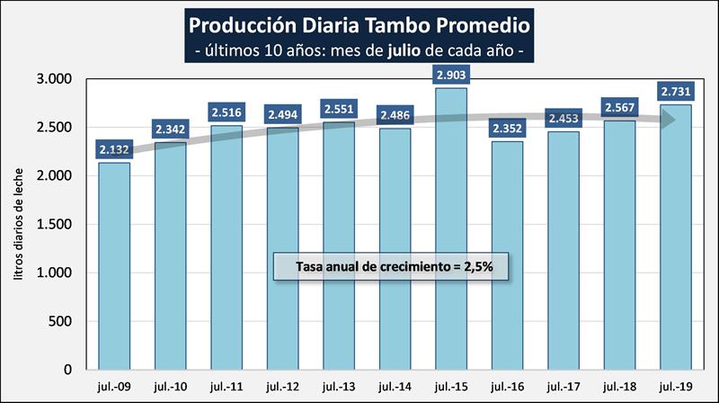 Sobre la base de la producción mensual y la cantidad anual estimada de tambos (publicada por SENASA para 2018, menos un 6%), podemos inferir el tamaño del tambo promedio, unos 2.731 litros de leche diarios para julio de 2019, un 6,4% más que el año anterior (cabe acotar que la producción en julio 2019, fue prácticamente igual a julio 2018). Si evaluamos su comportamiento en el tiempo, a pesar de la disminución en el número de unidades productivas y en el número de vacas (número no corroborado con los datos actuales de SENASA), el tambo promedio presenta en el período 2009-2019 una tasa de crecimiento acumulada anual del 2,5%, lo que permite, a pesar a la reducción en las unidades productivas y en el rodeo, el sostenimiento de los niveles productivos agregados a nivel país.