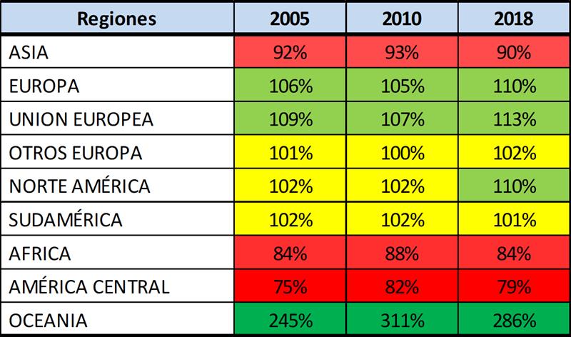 Determina la situación de autosuficiencia para el abastecimiento doméstico y los excedentes con destino a exportación de las diferentes regiones mundiales. Ratio de Autosuficiencia = producción de leche de la región / consumo doméstico.