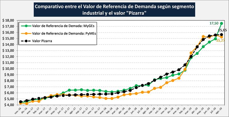 En el gráfico de abajo se subdivide la capacidad de pago o valor de referencia de demanda, entre Megas y Grandes Empresas (MyGEs) y Pequeñas y Medianas Empresas (PyMEs).