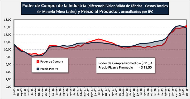 Viendo la capacidad de pago promedio de la industria, actualizada por IPC y comparada con el precio pizarra, para un período más largo, puede observarse que en el largo plazo (salvo oscilaciones temporales) los valores promedio convergen ($ 11,34 por litro de Poder de Compra y $ 11,50 por litro de Precio Pizarra).