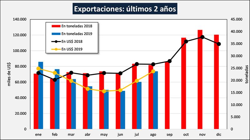 El mes de agosto en particular tuvo un volumen de exportación de 23.710 toneladas por un valor de US$ 73,8 millones, esto es +22,5% y +19,6% comparado con el mes anterior respectivamente (interanual: -9,8% en volumen y -10,9% en valor). Como puede verse en el gráfico de abajo, el incremento del mes de agosto revierte una tendencia de caída que se venía dando en los cinco meses anteriores.