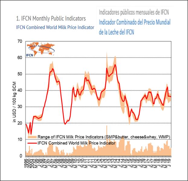 El Indicador combinado IFCN del Precio Mundial de la Leche ilustra el nivel de precios de leche en el mercado mundial. Representa el valor teórico que un procesador podría pagar a sus remitentes, comercializando sus productos en el mercado mundial y operando con costos industriales estándar.