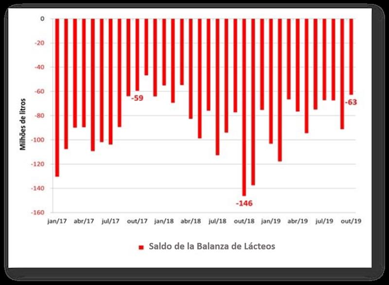 En cuanto a las exportaciones, también hubo una disminución en octubre. Los 8,8 millones de litros de leche equivalente exportados por Brasil representaron una caída del 13% en comparación con el 19 de septiembre y del 6% en comparación con oct/18. Vea la evolución en el saldo de la balanza comercial láctea, que fue de -63 millones de litros en octubre, gráfico 1.
