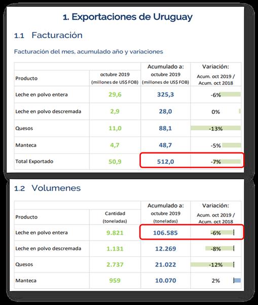 URUGUAY: Exportaciones de Lácteos a octubre de 2019 11/11/2019