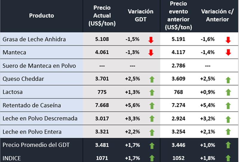 -GDT Price Index indica el promedio del cambio porcentual en los precios para cada especificación, ponderado por la cantidad de cada especificación vendida. GDT proporciona un cambio en el índice de precios de GDT del evento anterior para todos los productos, además de un equivalente para cada grupo de productos y cada combinación de grupo de productos/período de contrato. El índice de precios proporciona un reflejo más preciso de los movimientos de precios entre los eventos comerciales.