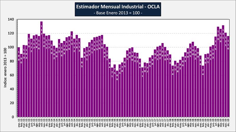 El EMI-OCLA asciende en diciembre de 2019 al valor 116, -7,2% respecto al mes anterior si consideramos el promedio diario y 17,2% más que igual mes del año anterior. Comparando los acumulados anuales, 2019 está un 17,5% por encima de 2018. Desde que se analiza este indicador (84 meses), el promedio de los 6 diciembres anteriores llega al valor índice 103,5 vs 116 actual (+12,1%).