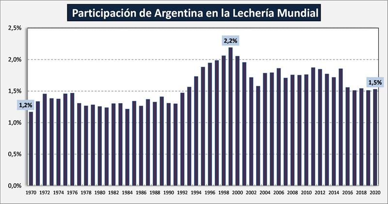 La participación de Argentina en el total mundial de leche de vaca se mantiene en los últimos años en el orden de 1,5%, con extremos, en la serie disponible, que llegaron a un mínimo de 1,2% en 1970 y un máximo de 2,2% en 1999.
