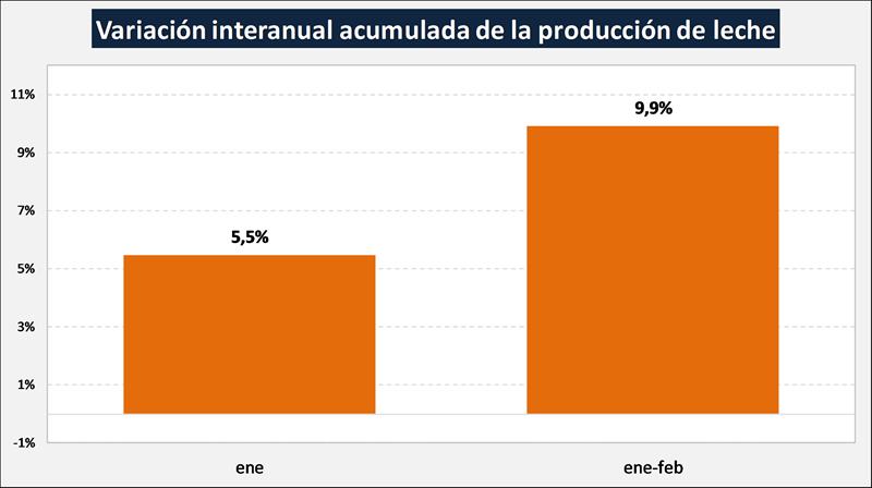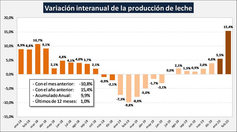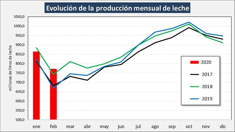En el mes de febrero de 2020 la producción fue de 771,2 millones de litros de leche, este valor representa una caída del 10,8% respecto al mes anterior y un 15,4% más que igual mes del año anterior. Si consideramos el promedio diario la caída intermensual fue del 4,7% y la variación interanual fue de +11,4%. El acumulado de los últimos 12 meses tiene un incremento del 1,0%, lo cual muestra la tendencia al crecimiento entre 2019 y la perspectiva 2020.