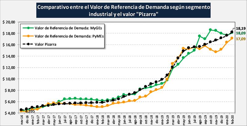 En el gráfico de abajo se subdivide la capacidad de pago o valor de referencia de demanda, entre Megas y Grandes Empresas (MyGEs) y Pequeñas y Medianas Empresas (PyMEs).