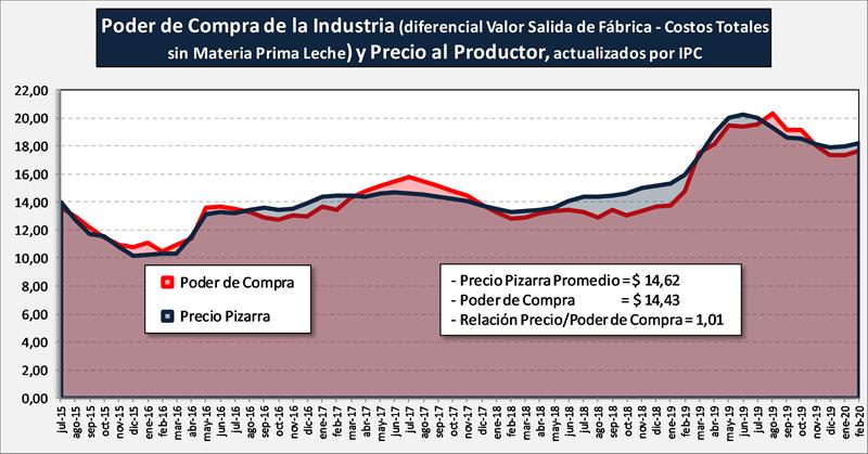 En el mes de febrero de 2020 la capacidad de pago según IAPUCo llega a $ 17,63/litro de leche y es inferior al precio real pagado que fue para ese mes de $ 18,19 (Panel 18 Empresas). Si observamos el comportamiento del Valor por Litro Equivalente de Salida de Fábrica (precio al que vende la industria), se incrementó en 1,8% (70,9% interanual) y el precio al Productor lo hizo en un 3,4% (71,1% interanual).